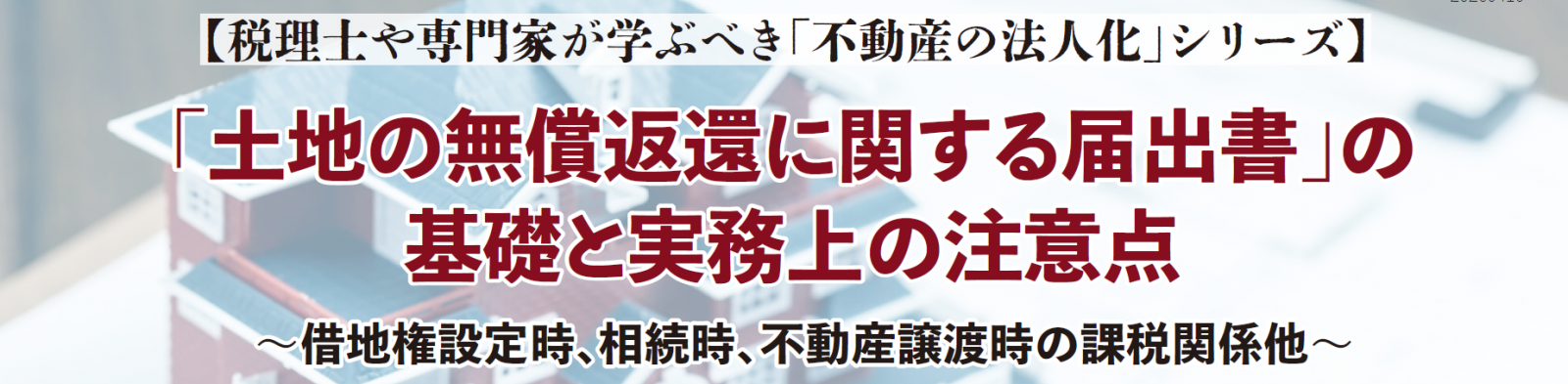 「不動産の法人化」などが行われた際に「土地の無償返還に関する届出書」いわゆる「無償返還届出書」が提出されることがあります。ところが「無償返還届出書」はどのような効果があり、なぜ提出しなくてはならないのかなど、その趣旨や目的などを顧客も税理士もきちんと理解しないまま提出しているケースが散見されます。また「無償返還届出書」を提出してから数年・数十年が経過すると、相続によって不動産の所有者が変わったりするなどして、提出をしていること自体が忘れ去られてしまうこともあります。しかし「無償返還届出書」が出ている場合と出ていない場合とでは、相続発生時の「相続税」や譲渡時の「所得税」などに直接的な影響があることから、その確認を怠ると大変大きなミスにつながる可能性があります。本講義は関連する「法人税基本通達」やいわゆる「相当の地代通達」を確認しながら「無償返還届出書」の趣旨や目的などについて正しく理解するとともに、不動産譲渡時の所得税等が問題になった裁決事例を紹介していきます。